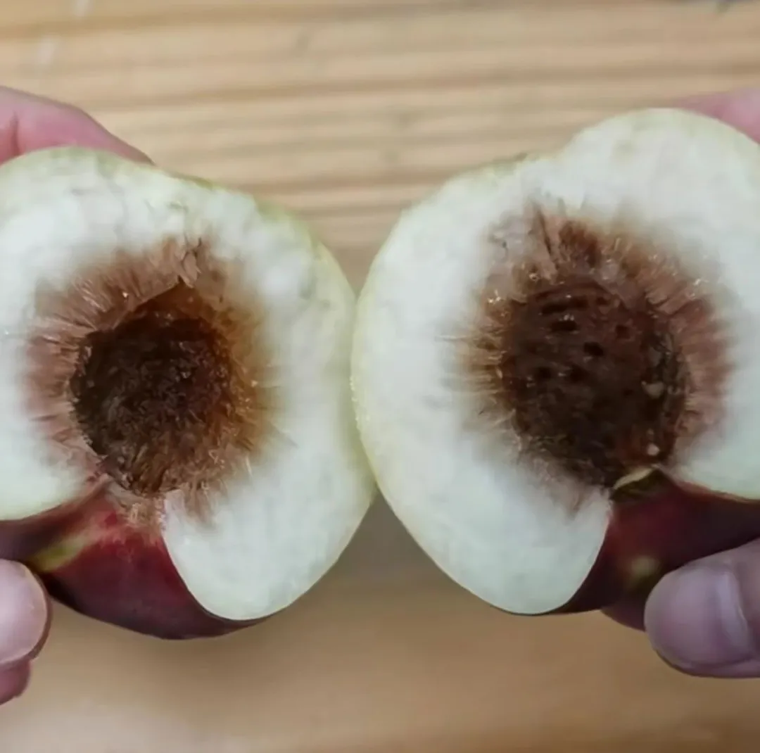 当李子内部出现核裂后,果肉会自动愈合,偶尔会产生一些果胶——这些白色晶体。这种情况也会发生在桃子上。
