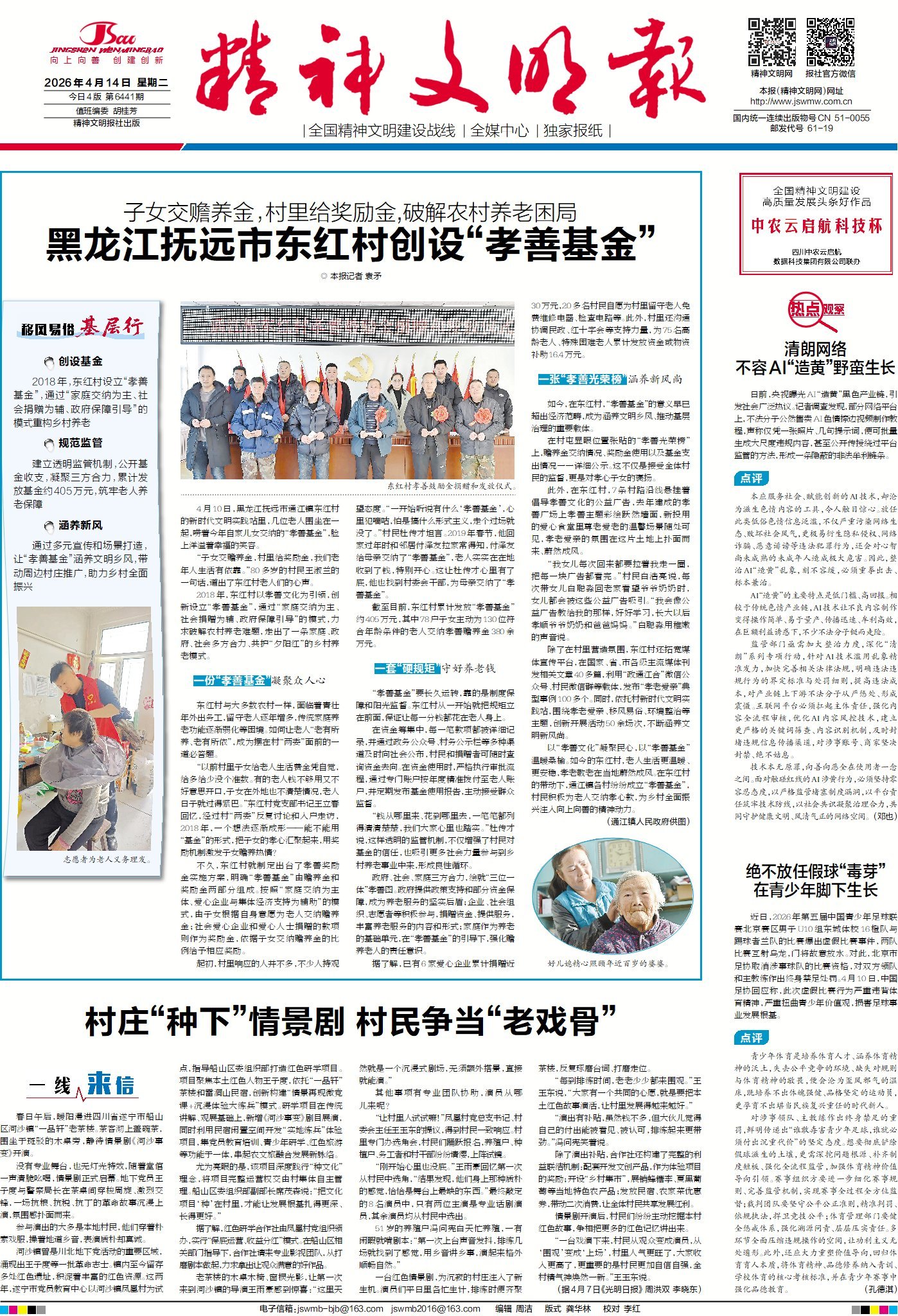 年轻人外出务工,农村留守老人增多、家庭养老功能弱化……面对这样现实难题,乡村老人如何安心养老?黑龙江抚远市通江镇东红村给出了温暖答案:2018年起,村里设立“孝善基金”,以子女交纳赡养金为基础、社会捐赠为补充、政府引导为保障,用透明机制管好每一笔钱。截至目前,累计发放基金约405万元,惠及百余位老人,既兜住了养老底线,更唤醒了孝老亲情。这一暖心实践,为破解乡村养老难题提供了有益借鉴。请关注今日1版《移风易俗基层行》栏目。