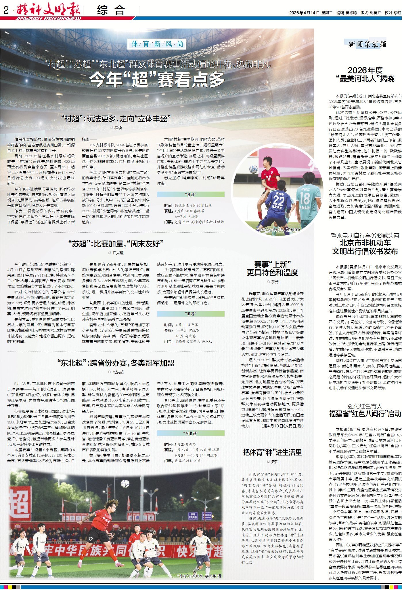 今年以来,各地群众体育赛事持续上新,因地制宜、创新办赛,既有特色又有温度。升级扩容的“村超”坚持零门票,非遗表演为乡土足球增添文化韵味;“周末友好”的“苏超”安排91场赛事,周周有球赛,也带动小店与国际品牌同台亮相;首届跨省举办的“东北超”迎来宁忠岩等冬奥冠军加盟,“一张球票闯关东”带来多重实惠。赛事持续火热,让运动与生活紧密相连,全民健身图景更加生动。详情请看今日2版。