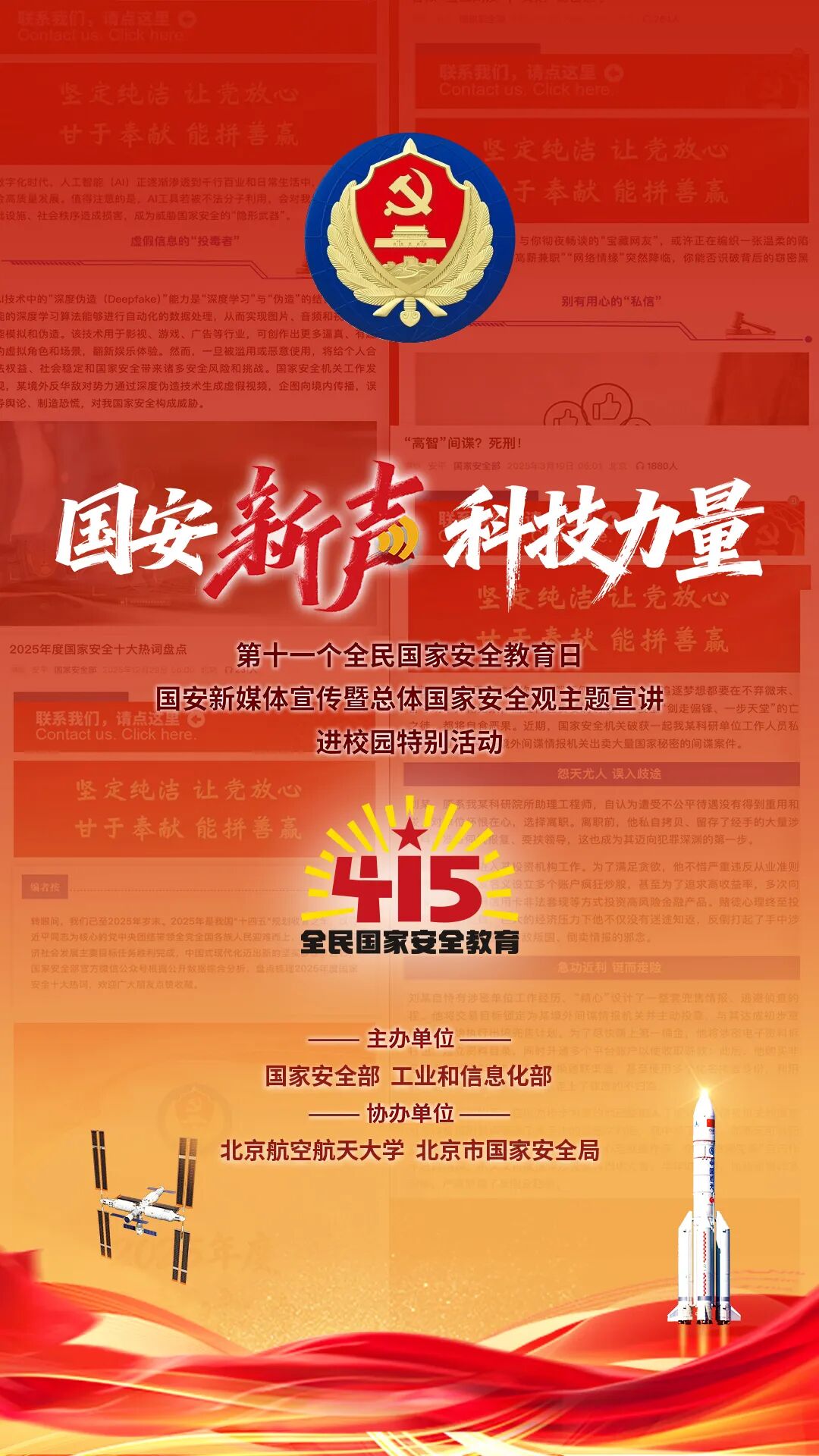今年4月15日是第十一个全民国家安全教育日,由国家安全部、工业和信息化部主办,北京航空航天大学、北京市国家安全局协办的“国安新声·科技力量”——总体国家安全观主题宣讲暨国安新媒体宣传活动正式官宣啦!