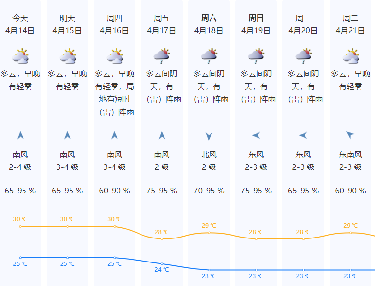 深圳今日多云,早晚有轻雾,气温25-30℃,相对湿度65-95 %。