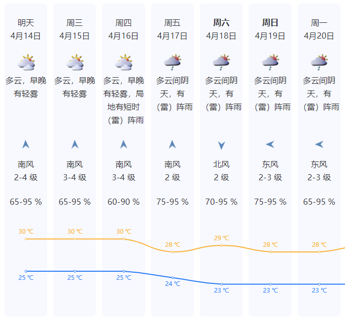 预计深圳14-16日受西南气流影响,多云为主,早晚有轻雾,偶有局地零星小雨,午间较热;14日气温25-30℃;