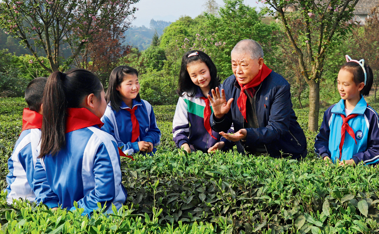 名山区离退休干部志愿服务队党支部书记张昌海在茶园为少先队员讲解知识。