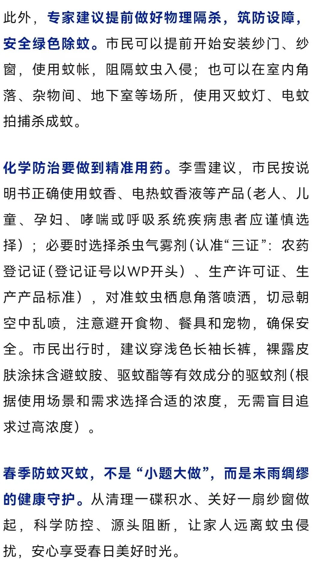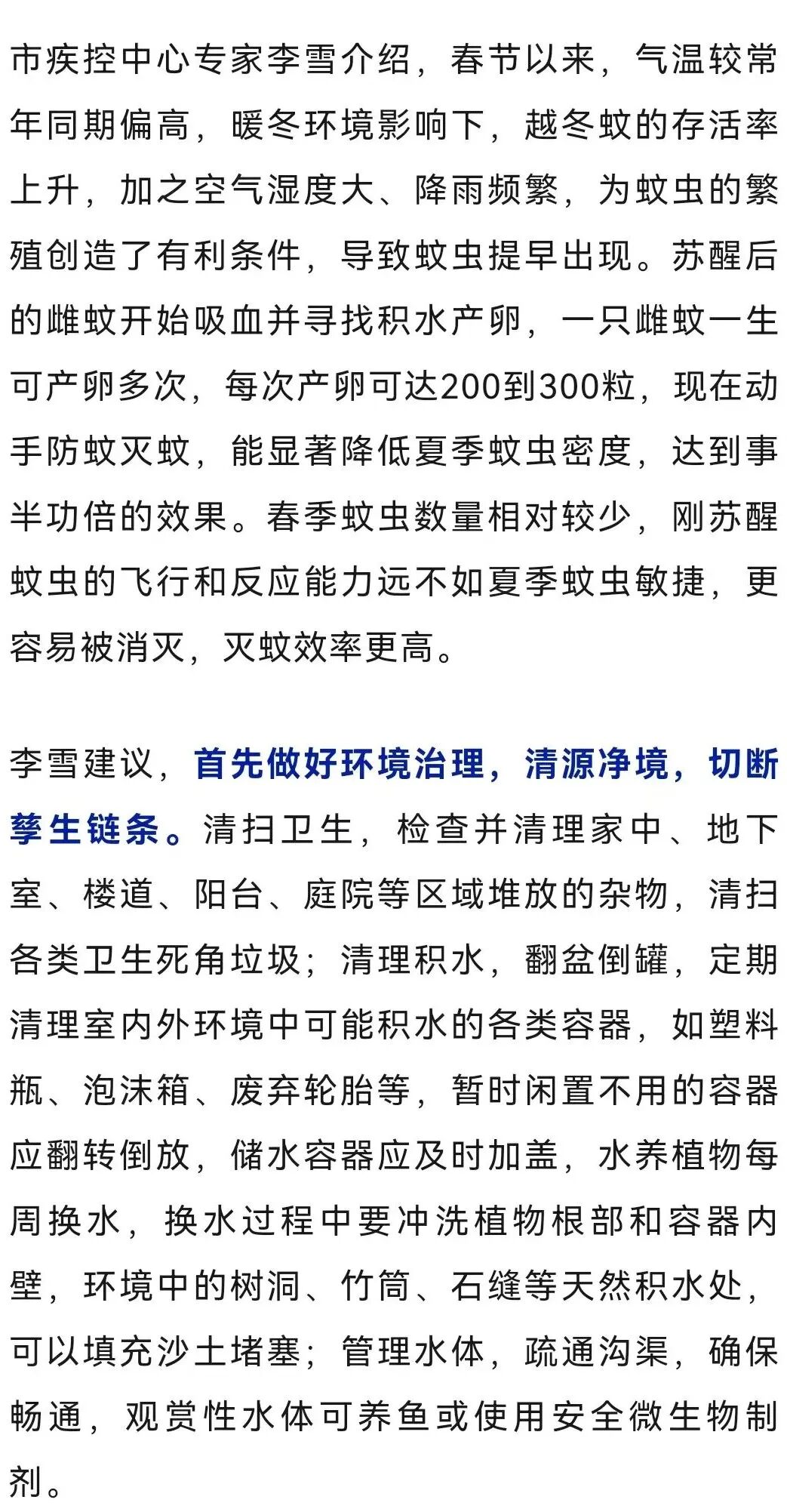 春风渐暖,万物复苏,沉寂了一整个冬天的蚊虫也开始悄悄繁殖。近日,青岛市疾控中心提醒,抓住春季防控关键期,做到早清理、早防护、早处置,能有效控制蚊虫密度,降低登革热、基孔肯雅热等蚊媒传染病的传播风险。