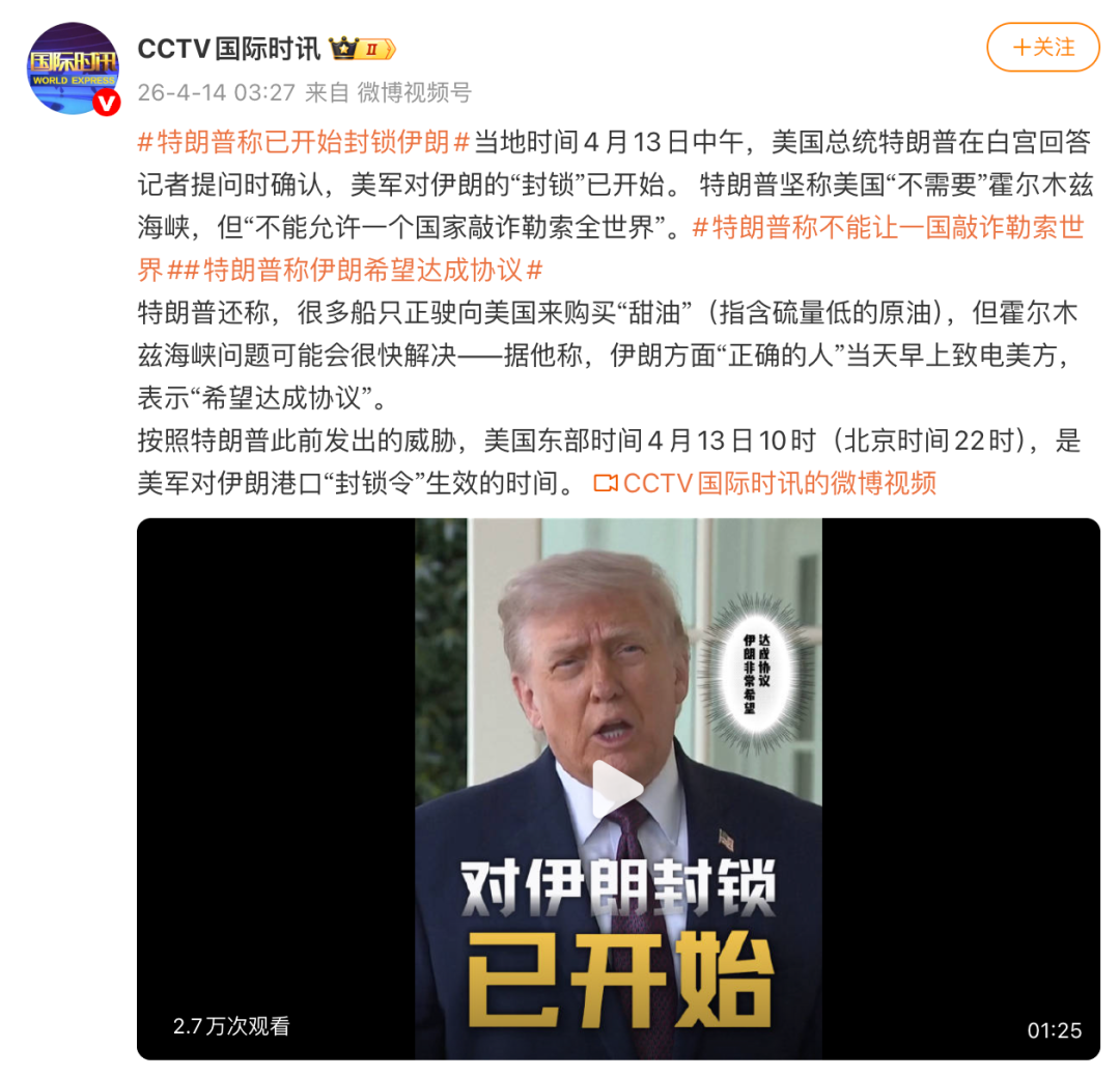 按照特朗普此前发出的威胁,美国东部时间4月13日10时(北京时间22时),是美军对伊朗港口“封锁令”生效的时间。
