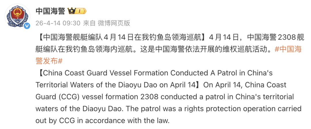 据中国海警4月14日消息,4月14日,中国海警2308舰艇编队在我钓鱼岛领海内巡航。这是中国海警依法开展的维权巡航活动。