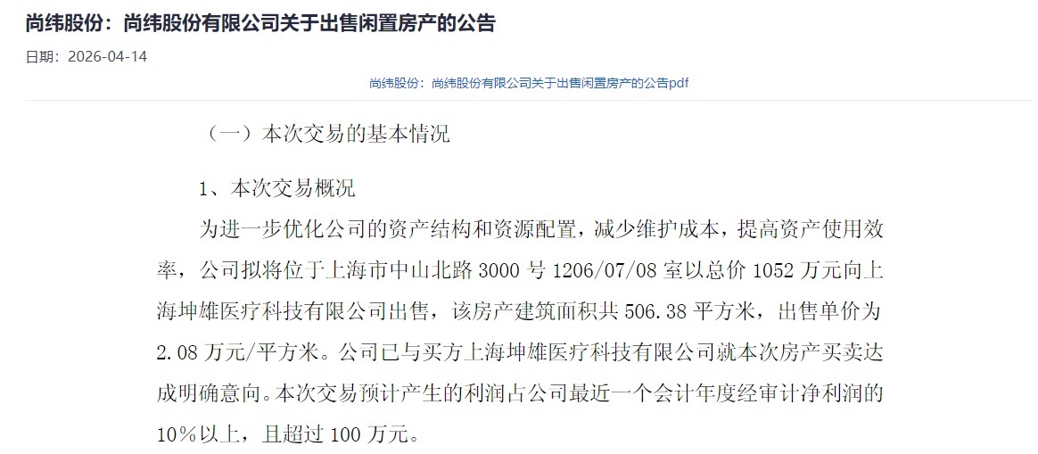 落实到财务层面,尚纬股份本次拟处置的闲置房产成交价预计为1052万元,经初步测算,本次交易预计将会增加2026年利润总额约600万元,预计将对公司当期利润产生一定的积极影响。上述交易对应的具体会计处理及对公司2026年度损益的影响,最终以年度审计报告为准。