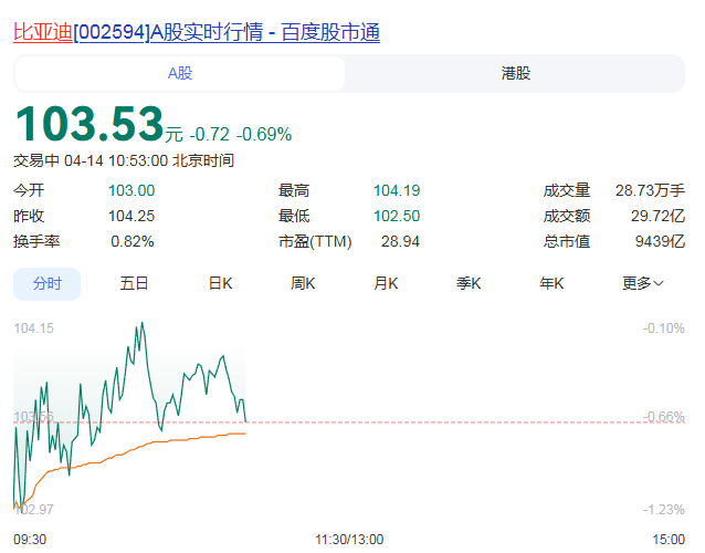 14日,比亚迪A股盘初跌超1%。截至10时52分,比亚迪A股报103.53元/股,跌幅有所收窄。