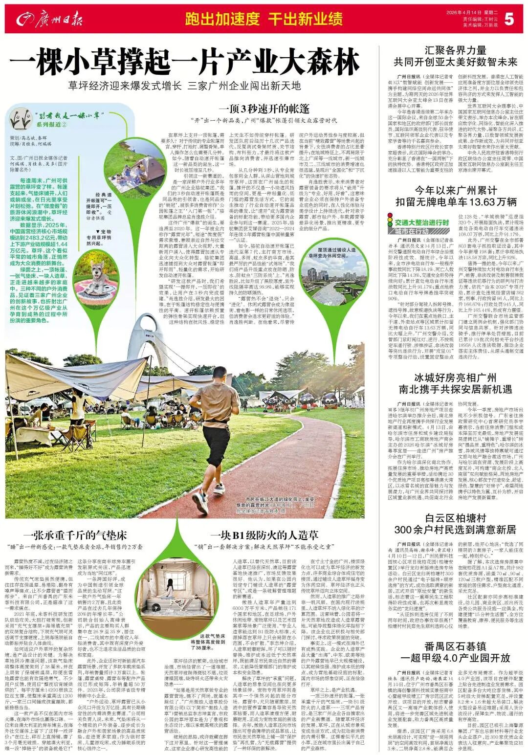一顶三秒速开的帐篷,一张承重千斤的气垫床,一块B1级防火的人造草……三项产品背后,是三家广州企业各自摸索出的产业新赛道。随着草坪经济的发展,草坪,正在从城市景观变成生活方式,成为拉动新消费的内需引擎。这棵看似平凡的小草,正在城市里长出属于自己的产业森林。