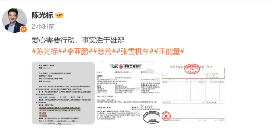 4月8日,陈光标在社交平台公布了其向嫣然天使儿童医院捐赠的1000万元善款的具体使用范围。捐赠协议第三条“捐赠财产用途”明确写明,该笔款项可用于医院运营、患儿救助、支付房租及其他非限定性支出。此前,陈光标因张雪先生迟迟未来提车,决定尊重张雪意愿,将原计划赠予的劳斯莱斯幻影车辆变现,并将所得1000万元资金捐赠给嫣然天使儿童医院。