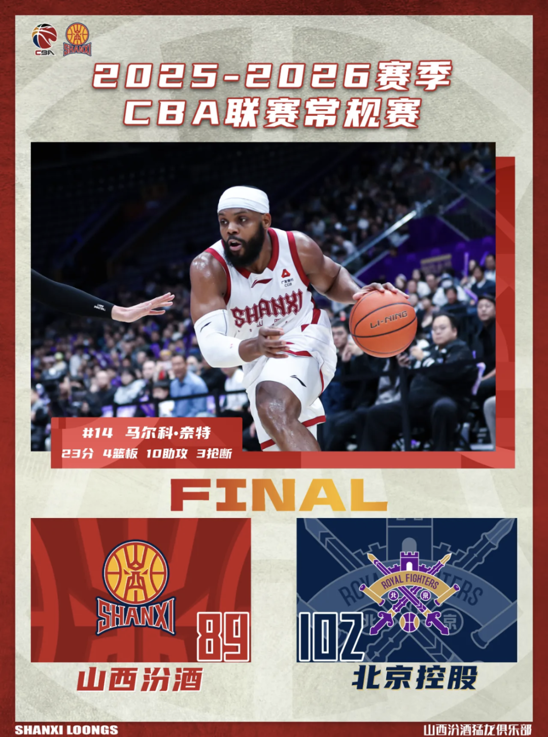 4月13日,2025-2026赛季CBA联赛第38轮全面展开。山西汾酒男篮末节崩盘,客场以89比102不敌北京控股队。
