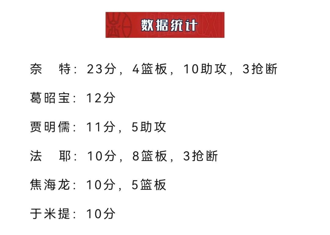 随着比赛进行,大比分落后的山西男篮作出人员调整,外援奈特披挂上阵。这位37岁的老将登场后,不仅连续送出助攻,而且在中场结束前命中“压哨”球,帮助山西男篮将比分迫近至47比52。