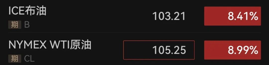 WTI原油期货开盘暴涨8%,报104.9美元/桶,布伦特原油期货高开近8%,报102.45美元/桶。截至发稿时,国际油价仍在持续走高,WYI原油期货价格一度涨超9%。