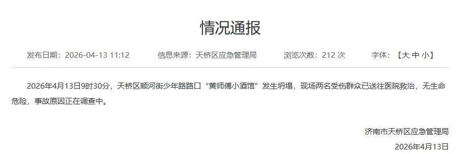 4月13日,山东济南市天桥区应急管理局发布情况通报:2026年4月13日9时30分,天桥区顺河街少年路路口“黄师傅小酒馆”发生坍塌,现场两名受伤群众已送往医院救治,无生命危险,事故原因正在调查中。
