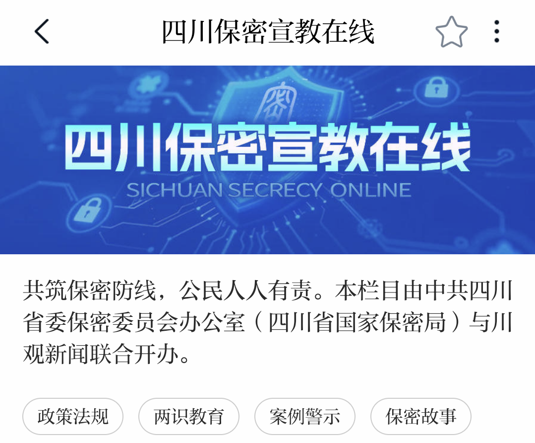 保密工作是维护国家安全和利益的基础性、全局性、长远性工作。当前,随着信息化、网络化深入发展,保密工作面临的形势日益严峻复杂,强化全民保密意识、普及保密法律法规、提升全民保密防范技能,已成为新时代保密工作的重要任务。为深入贯彻落实总体国家安全观,进一步提升全社会保密防范能力,省委保密办(省国家保密局)携手川观新闻,依托主流媒体传播优势与保密部门专业优势,搭建“四川保密宣教在线”权威宣教平台,旨在推动保密宣传教育常态化、长效化开展,以全力营造“共筑保密防线,公民人人有责”的社会氛围。