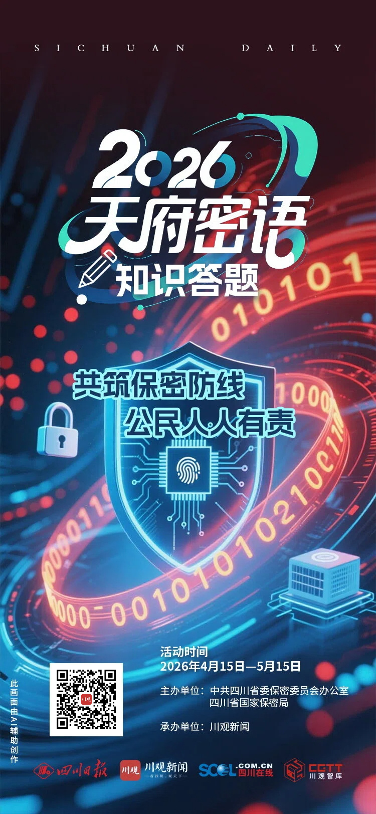 共筑保密防线,公民人人有责。4月15日,在第38个全国保密宣传教育月到来之际,由中共四川省委保密委员会办公室(四川省国家保密局)主办、川观新闻承办的2026“天府密语”知识答题活动正式启动。活动将持续至5月15日,全省广大党员干部群众均可登录川观新闻客户端参与答题,边学保密知识、边赢取奖励。