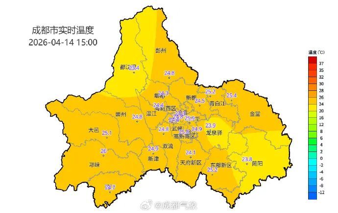 当“成都之巅”下雪时,山下的小编却穿着短袖。今天15时,全市平均温度为25℃,最高气温达26℃。