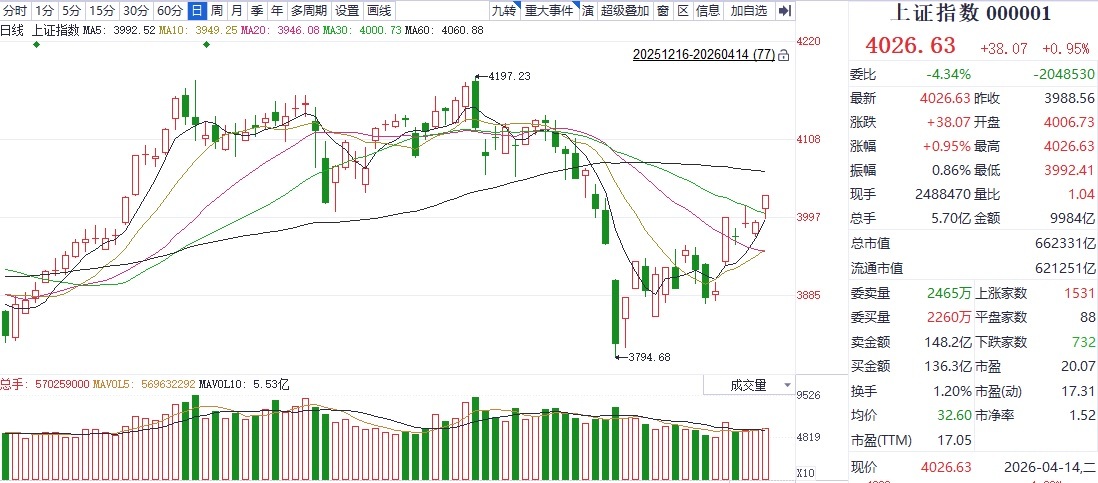 经过几个交易日的蓄势冲关,4月14日上证指数顺利收复4000点整数关口。同日,深证成指创出了本轮反弹行情的新高,创业板指则继续将阶段性高点上移。