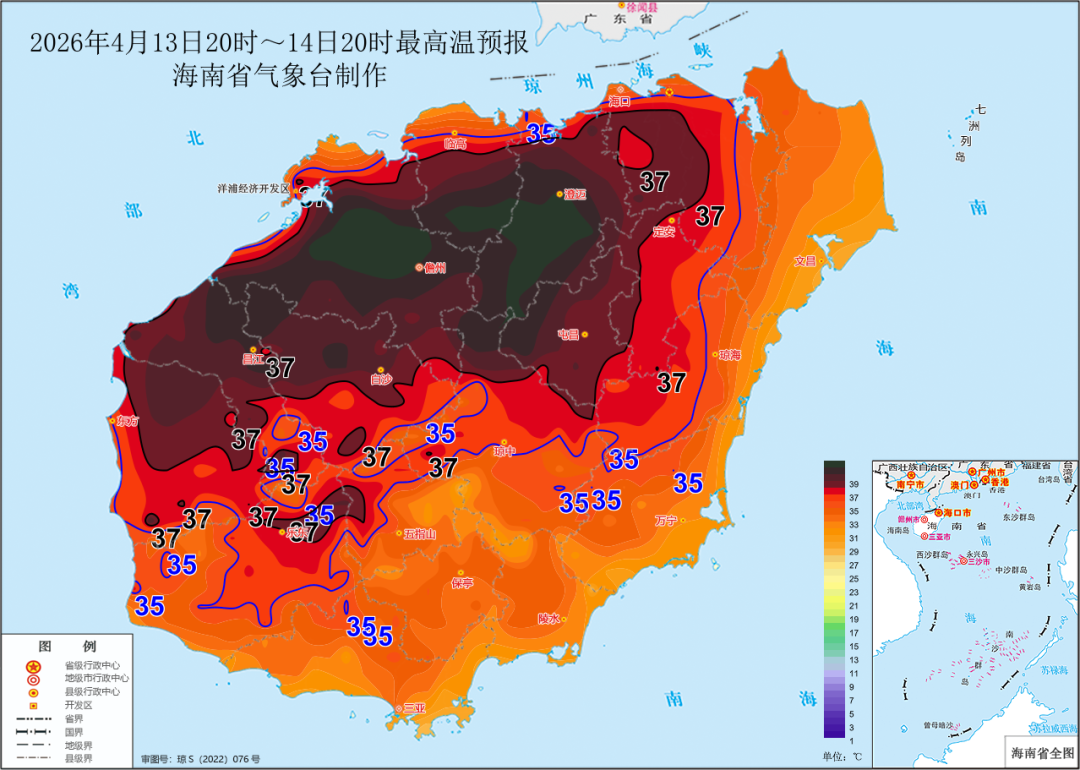 海南省气象局2026年04月13日16时30分继续发布高温三级预警:预计4月14日白天,海口、澄迈、临高、定安、屯昌、儋州、白沙、昌江和东方等9个市县的大部分乡镇将出现37摄氏度以上的高温天气,其中昌江、白沙、儋州、临高和澄迈部分乡镇气温可达40摄氏度以上,请有关单位做好防暑降温、森林防灭火等相关工作。