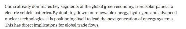 文章关注到,该规划纲要将绿色发展置于中国经济转型的核心位置。中国已在全球绿色经济的关键领域占据主导地位,从太阳能电池板到电动汽车电池,无一例外。通过加大对可再生能源、氢能以及先进核能技术的投入,中国正致力于成为下一代能源体系的引领者。这将对全球贸易格局产生直接影响。
