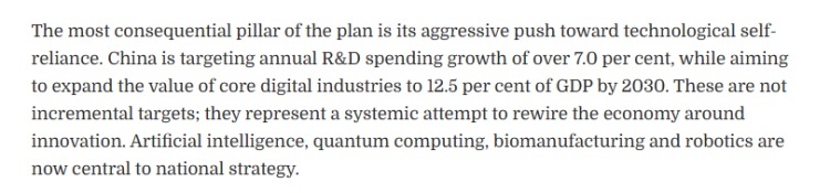 文章认为,“十五五”规划纲要最具分量的支柱,在于对科技自立自强的强力推进。中国明确提出,研发经费支出年均增长将超过7.0%,并力争到2030年,核心数字经济产业增加值占GDP的比重提升至12.5%。这些并非渐进式目标,而是一场以创新为核心、系统重构经济体系的战略转型。人工智能、量子计算、生物制造与机器人技术,已全面上升为国家战略的核心。