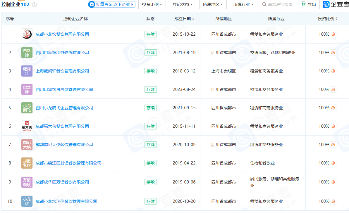 以川派火锅代表小龙坎为例,该公司成立于2020年3月,总部位于成都,已在全国开设超过800家门店,并入选成渝地区双城经济圈企业社会责任百强榜。经历了多轮融资后,小龙坎旗下控制企业上百家,其中四川自然馋冷链物流有限公司、成都蜀大侠餐饮管理有限公司、成都成华区万记餐饮有限公司等投资比例达100%。