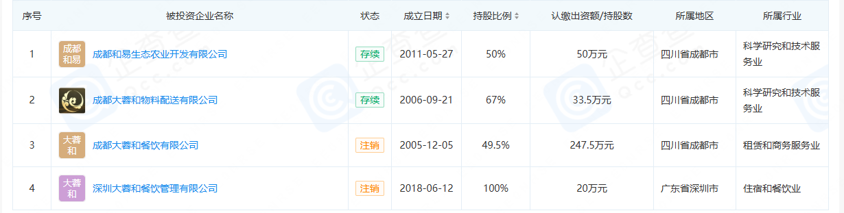 另一典型案例是遍布成都东南西北的大蓉和餐饮。企查查显示,成都大蓉和餐饮管理有限公司成立于2004年,连续多年入选中国餐饮品牌力百强榜单。在对外投资方面,其持有成都和易生态农业开发有限公司50%股权、成都大蓉和物料配送有限公司67%股权。