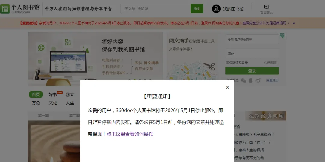 即日起,360doc个人图书馆网站暂停新内容发布,但登录、数据备份、VIP退费申请、钱包提现功能均正常开放。提醒用户在5月1日前,备份文章并处理退费提现!