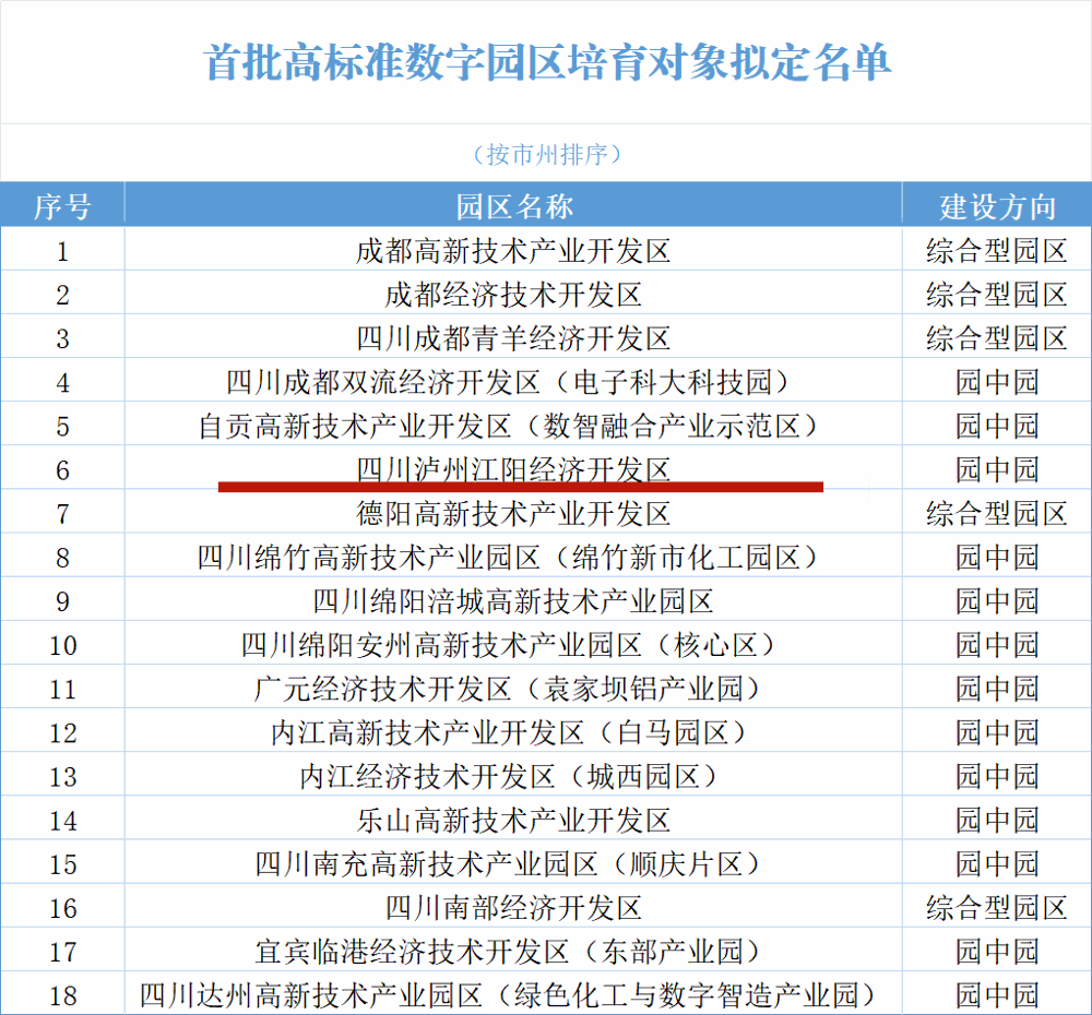近日,四川省经济和信息化厅公示首批高标准数字园区培育对象拟定名单,全省18个园区入选,公示时间为2026年4月10日—2026年4月13日。其中,四川泸州江阳经济开发区作为唯一一个白酒产业园入选。