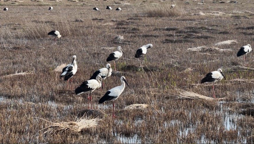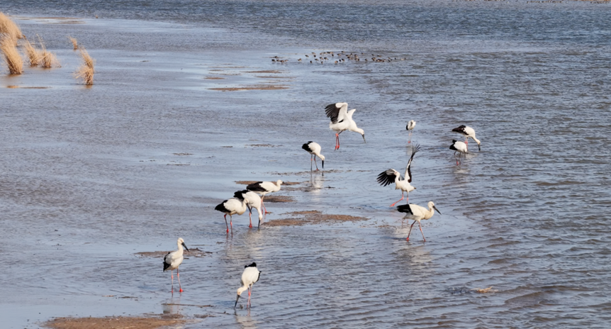 据观测,今年以来东方白鹳在该区域的停留时间明显延长,总计数量已突破400只,这在近年来的同期观测中实属罕见。在波光粼粼的水面上,成群的东方白鹳时而引颈高歌,时而低头觅食,它们修长的红色双足在浅滩上留下一串串生命的足迹。有的成双成对在干枯的芦苇茬中优雅踱步,有的则张开宽大的黑白双羽,在蔚蓝的天空下轻盈滑翔。