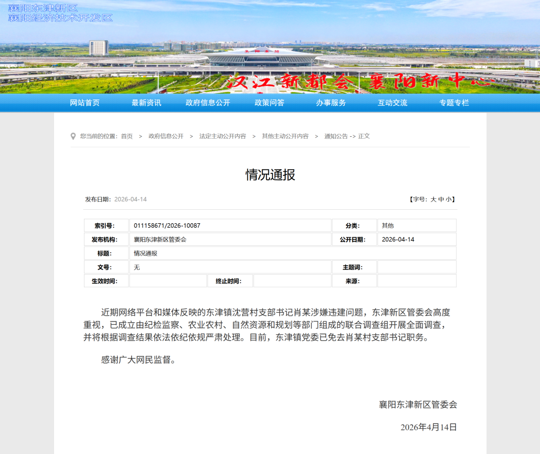 今天(14日),湖北省襄阳东津新区管委会发布情况通报,全文如下: