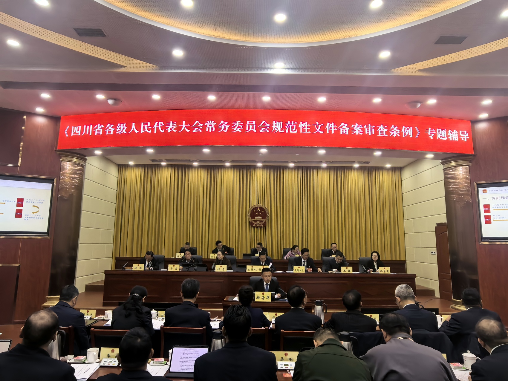 会前,甘孜州人大常委会法工副主任何晓健为常委会组成人员讲授《四川省各级人民代表大会常务委员会规范性文件备案审查条例》