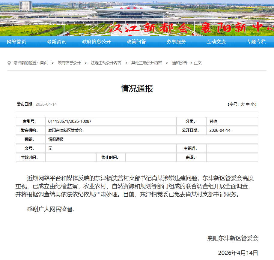 近期网络平台和媒体反映的东津镇沈营村支部书记肖某涉嫌违建问题,东津新区管委会已成立由纪检监察、农业农村、自然资源和规划等部门组成的联合调查组开展全面调查,并将根据调查结果依法依纪依规严肃处理。目前,东津镇党委已免去肖某村支部书记职务。