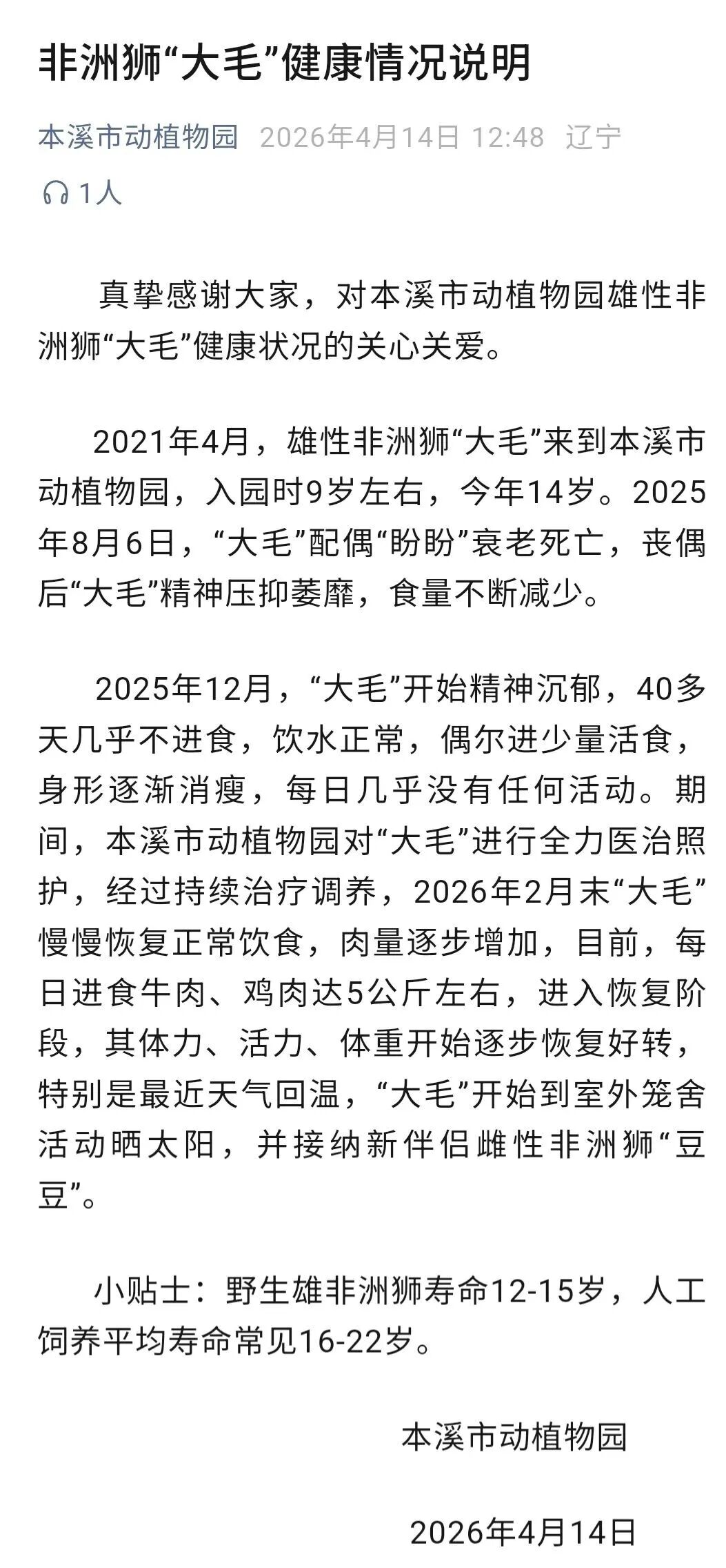 2021年4月,雄性非洲狮“大毛”来到本溪市动植物园,入园时9岁左右,今年14岁。2025年8月6日,“大毛”配偶“盼盼”衰老死亡,丧偶后“大毛”精神压抑萎靡,食量不断减少。