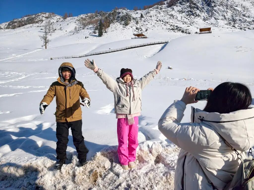 2026年1月,台湾青年在新疆喀纳斯景区的雪地里拍照。图源:新华社