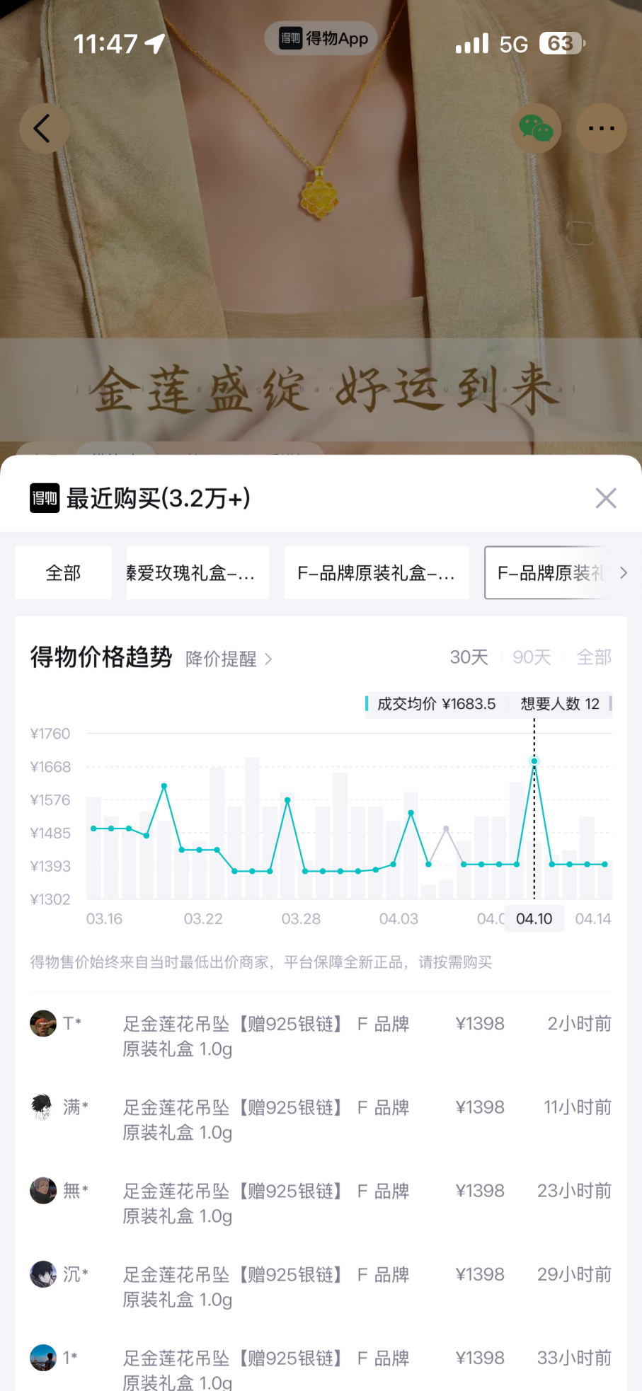 得物App数据显示,近一周,“一口价”金价波动集中在3000元以下的黄金配饰产品,3000元以上的黄金配饰暂未出现明显变化。老凤祥的莲花吊坠(1g)近一周市场成交价由峰值1683元下跌至1398元,下跌了285元,下跌17%;中国黄金四叶草吊坠(0.3g)市场成交价由579元下跌至504元,下跌了75元,下跌13%;中国黄金小金马手链市场成交价由876元下跌至798元,下跌了78元,下跌9%。