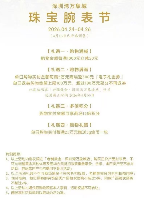 高端品牌开启叠加让利:甚至连一向主打高端客群的老铺黄金也加入了春季大促。记者获悉,老铺黄金深圳湾万象城店已于4月13日开启珠宝腕表品类的预售活动,不仅给出了“每满1000元立减50元”的直接让利,还辅以购物满返、多倍积分等组合优惠,试图在逆风局中稳住高净值客群的消费基本盘。