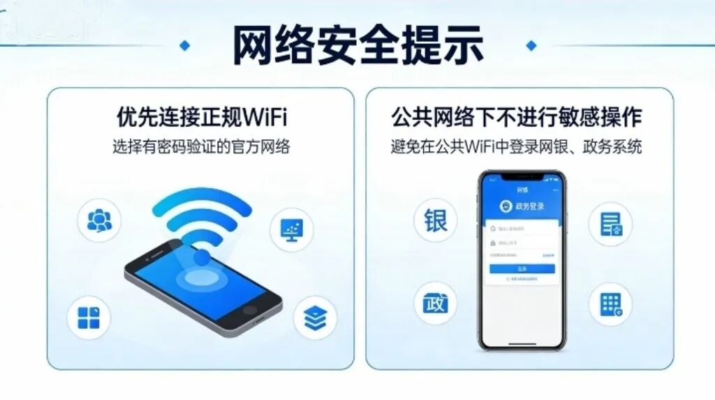 公共场所存在同名虚假WiFi,连接后可能被窃取浏览记录、支付密码,或植入病毒,尤其在处理政务、工作信息时风险更高。