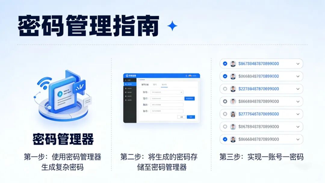 密码管理 使用“密码管理器”生成并存储复杂密码,做到一账号一密码。