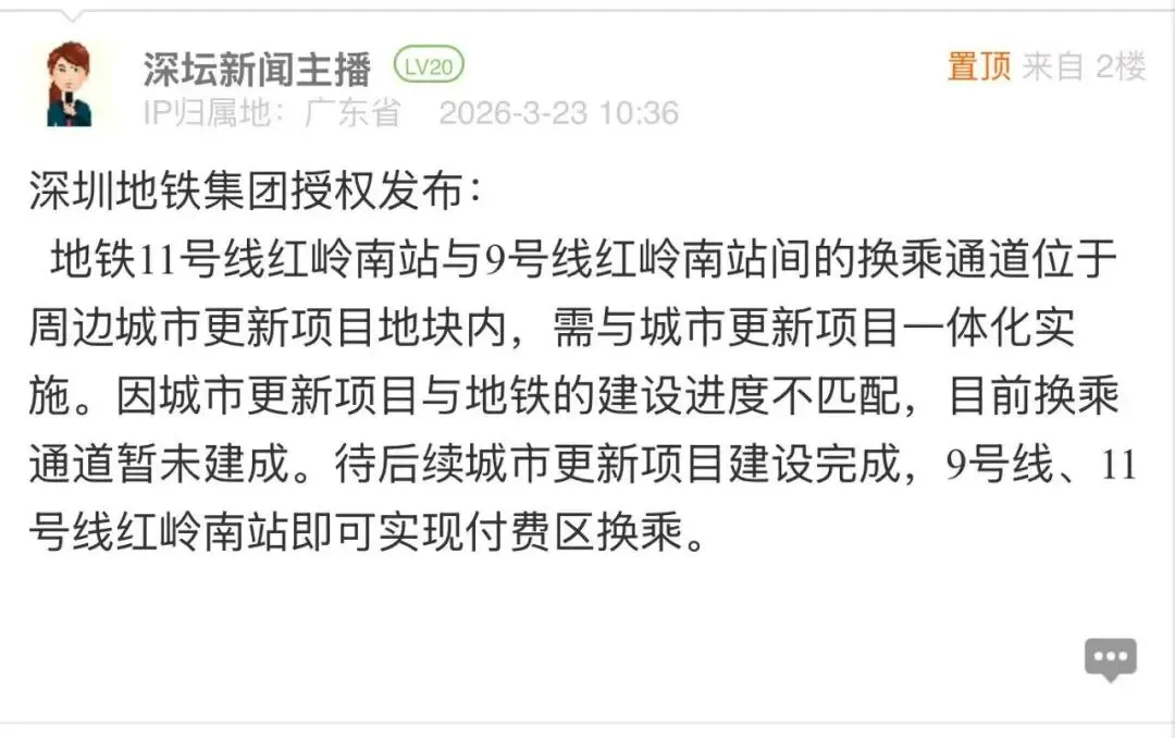 对此,深圳地铁也回应了发帖网友提出的问题。其称,地铁11号线红岭南站与9号线红岭南站间的换乘通道位于周边城市更新项目地块内,需与城市更新项目一体化实施。