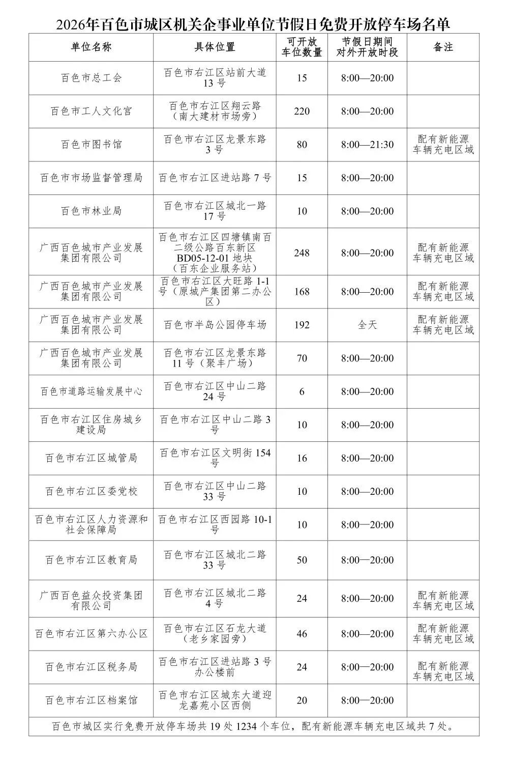 据“文明百色”微信公众号消息:2026年法定节假日期间,百色城区免费开放的机关企事业单位停车场由16处、1166个车位,调整更新为19处、1234个车位,其中配套新能源汽车充电区域的停车场7处。