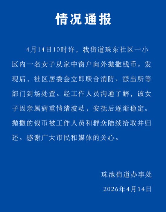 4月14日10时许,我街道珠东社区一小区内一名女子从家中窗户向外抛撒钱币。发现后,社区居委会立即联合消防、派出所等部门到场处置。经工作人员沟通了解,该女子因亲属病重情绪波动,安抚后逐渐稳定。抛撒的钱币被工作人员和群众陆续拾取并归还。感谢广大市民和媒体的关心。