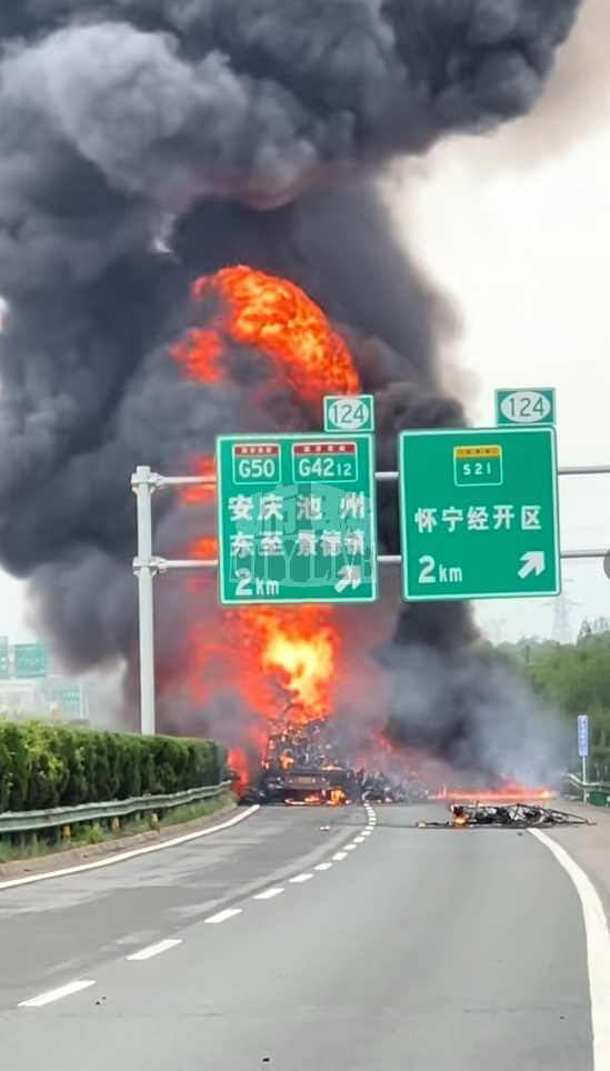 今天(4月14日)下午,合安高速安徽省安庆市怀宁县境内突发车辆起火事故,一辆运载车辆的半挂车在行驶途中突发火情。