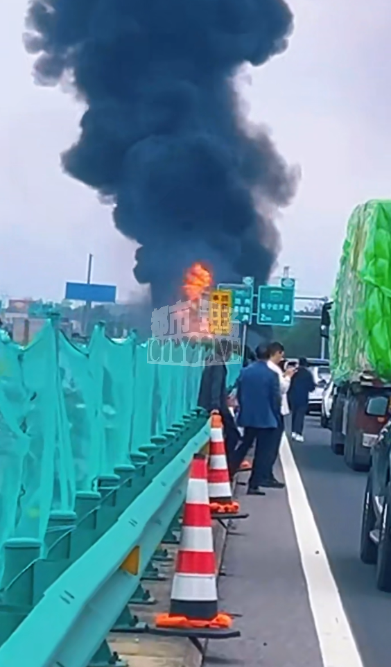 从现场画面可见,火焰裹挟着浓密黑烟疯狂翻涌,不仅吞噬了车辆本体,还快速扩散至相邻两个车道,滚滚浓烟直冲天际。