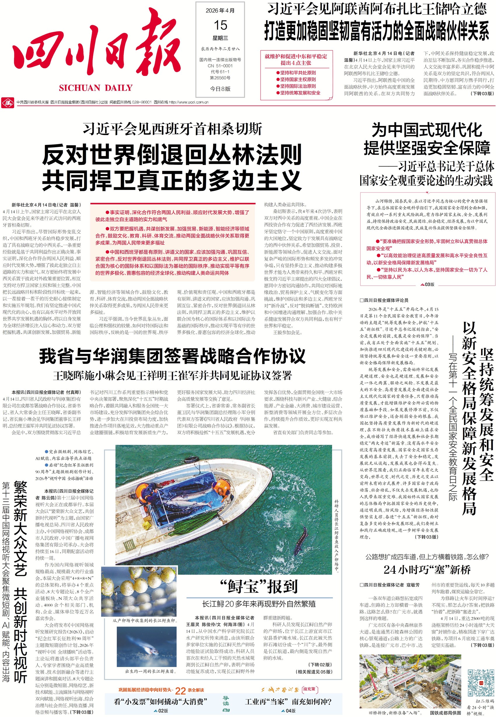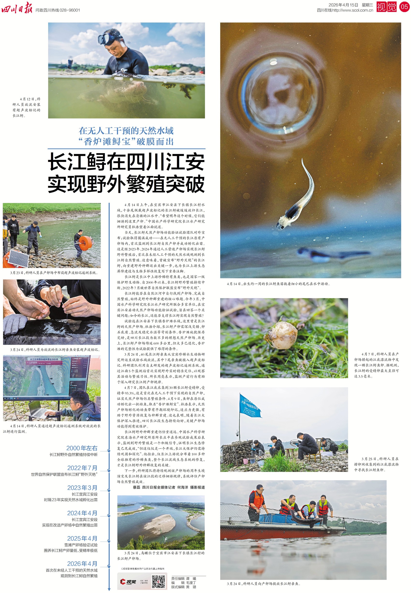 4月14日,长江鲟天然产卵场功能验证试验在宜宾江安县取得圆满成功,在无人工干预的长江原有产卵场内,首次监测到长江鲟自然产卵并成功孵化出幼苗,这一突破标志着曾被宣布“野外灭绝”的长江鲟在重建野外种群上迈出关键一步,也印证了长江大保护与生态修复成效显著。关注一版五版,看长江鲟实现野外繁殖突破。