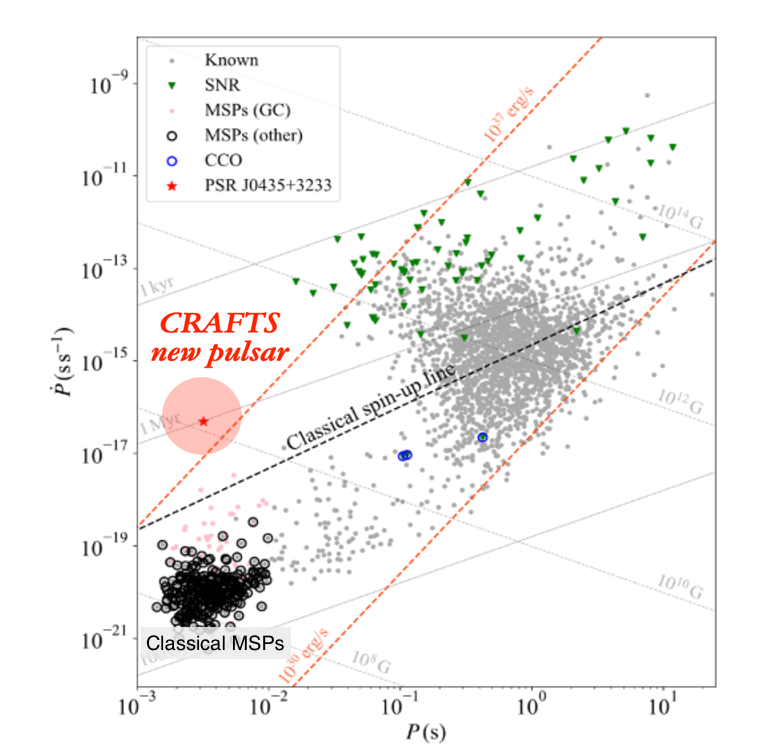 已知脉冲星与新发现脉冲星PSR J0435+3233的周期-周期变化率图,突出显示了PSR J0435+3233与经典毫秒脉冲星在周期变化率上的显著差异。