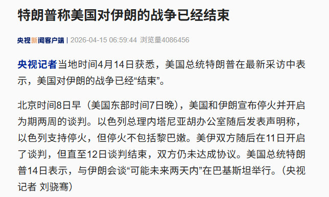 据央视新闻,央视记者当地时间4月14日获悉,美国总统特朗普在最新采访中表示,美国对伊朗的战争已经“结束”。