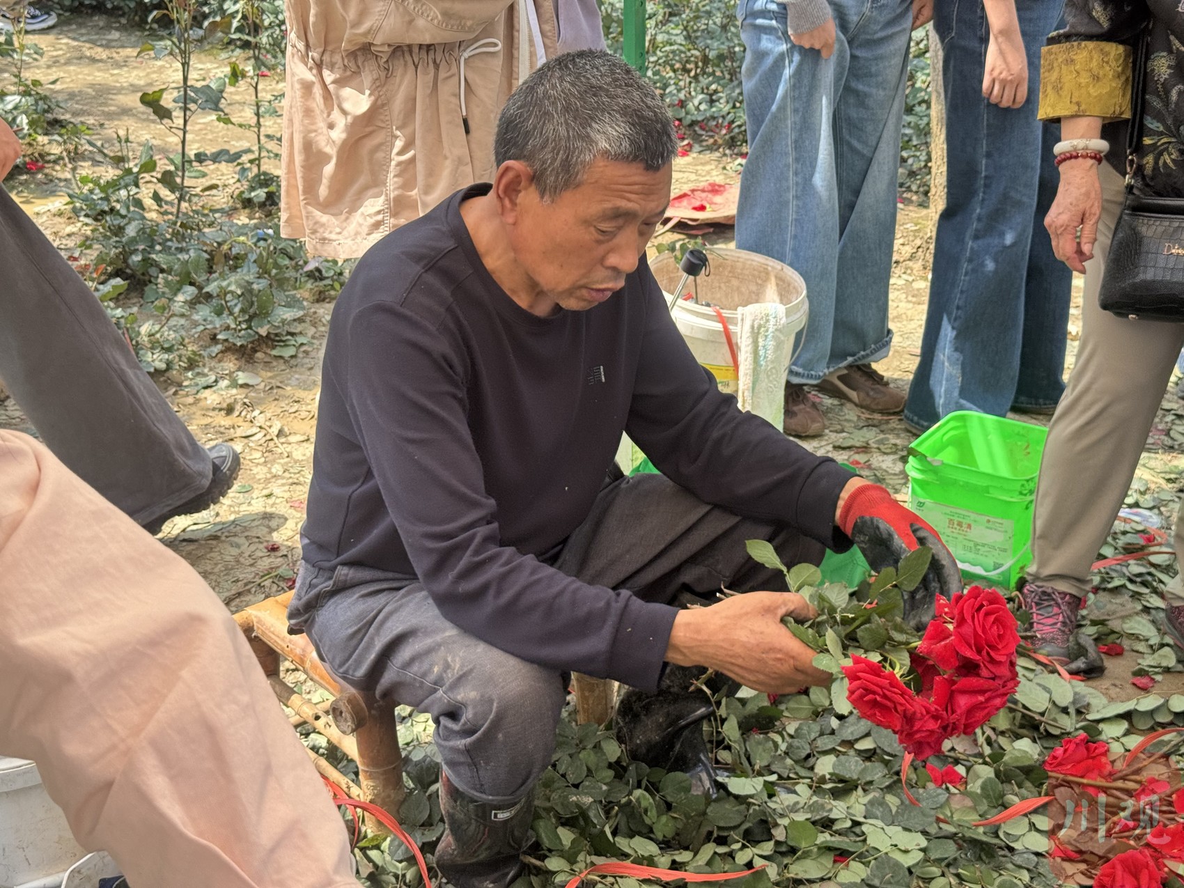话虽如此,但赚钱并不容易。为了应对激增的游客,邓春伦紧急添置了二十多把剪刀和二十多个桶,免费供大家剪花使用。他和两名帮手在花田中央搭起简易棚子,一边为市民修剪花刺、整理花束,一边负责收款结账,忙得连喝口水的时间都没有。
