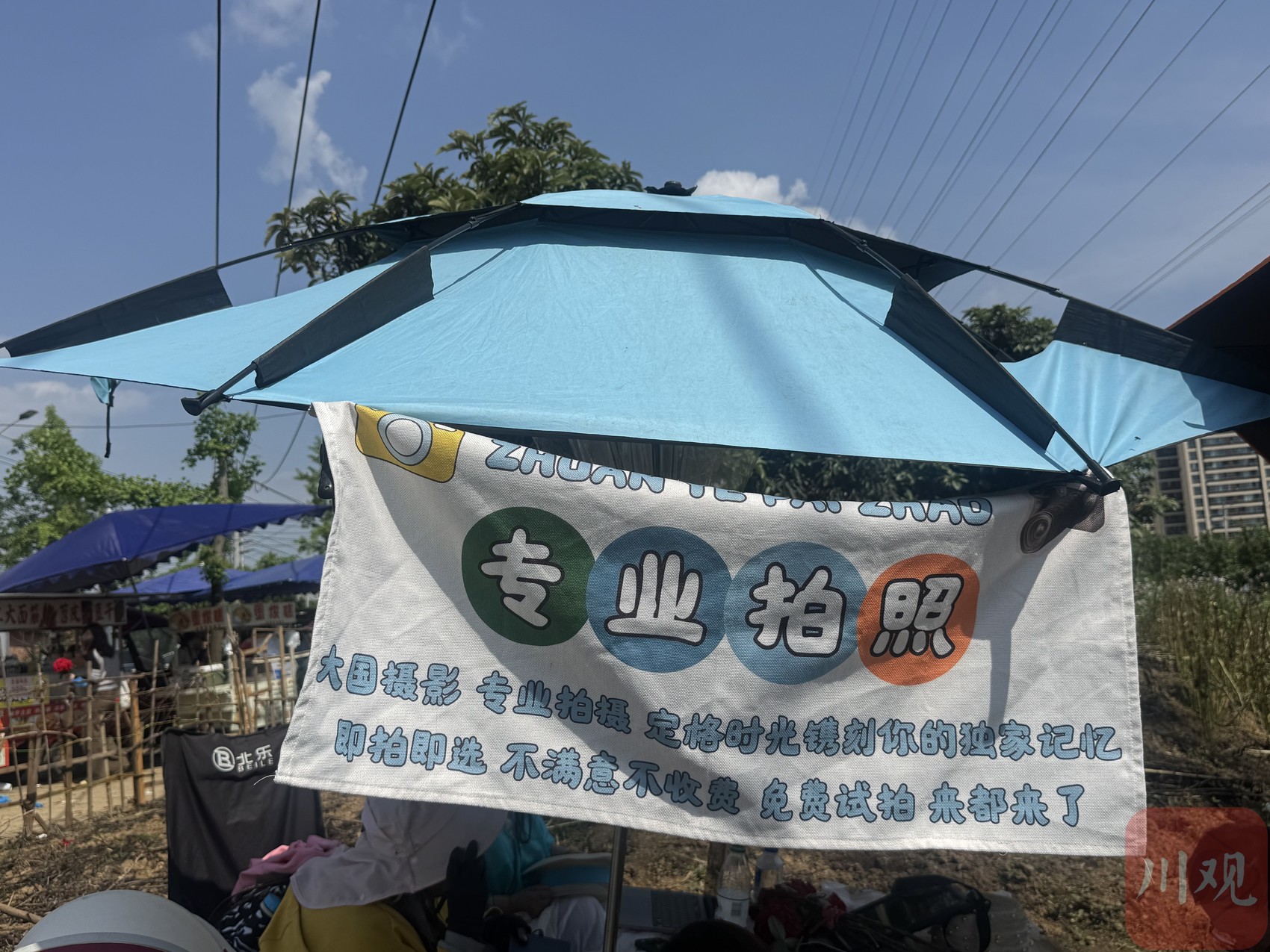 现场还有卖樱桃、鲜花、烤肠的,从这条不足百米的街道走过,每户摊主前生意都不错。有不少摄影师现场揽客:“20元一张精修、10元一张直出,要不要拍?”