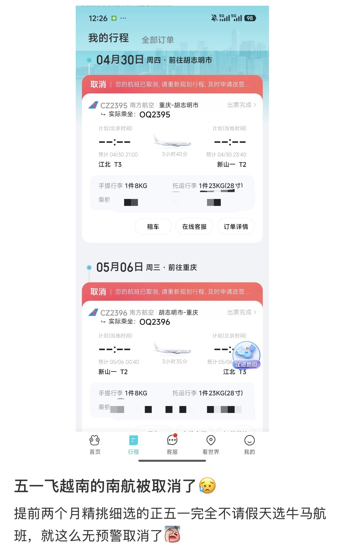 “提前一个多月预订的航班,突然被取消了。”近日,一些网友在社交平台上纷纷吐槽航班被临时取消的经历。其中一名网友反映,自己预订的5月7日乌鲁木齐直飞郑州的南航航班被取消。随着“五一”假期临近,一些早已订好酒店、门票的旅客,被航班取消的通知彻底打乱了计划。